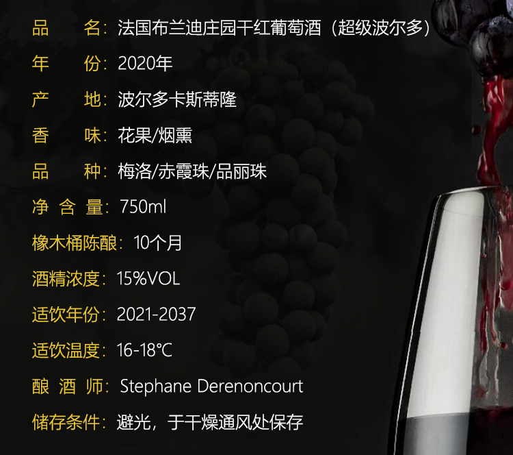 商品名称: 路易城堡(CHATEAU LOUIS)2020布兰迪庄园超波 干红葡萄酒 波尔多卡斯蒂隆【法国进口红酒】 单支装红酒